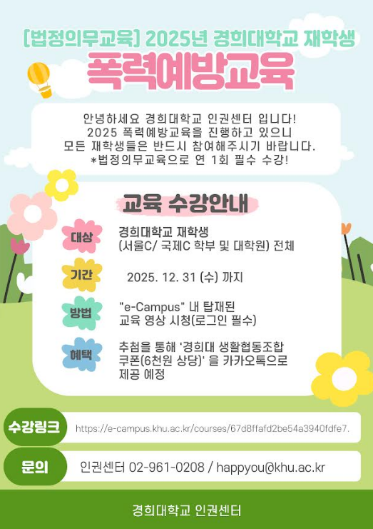 이수증을 별도 제출할 필요는 없으며 추첨을 통하여 경희대 생활협동조합 쿠폰(6천원 상당)을 카카오톡으로 제공 예정임 <문의 사항 : 인권센터 02-961-0208>
