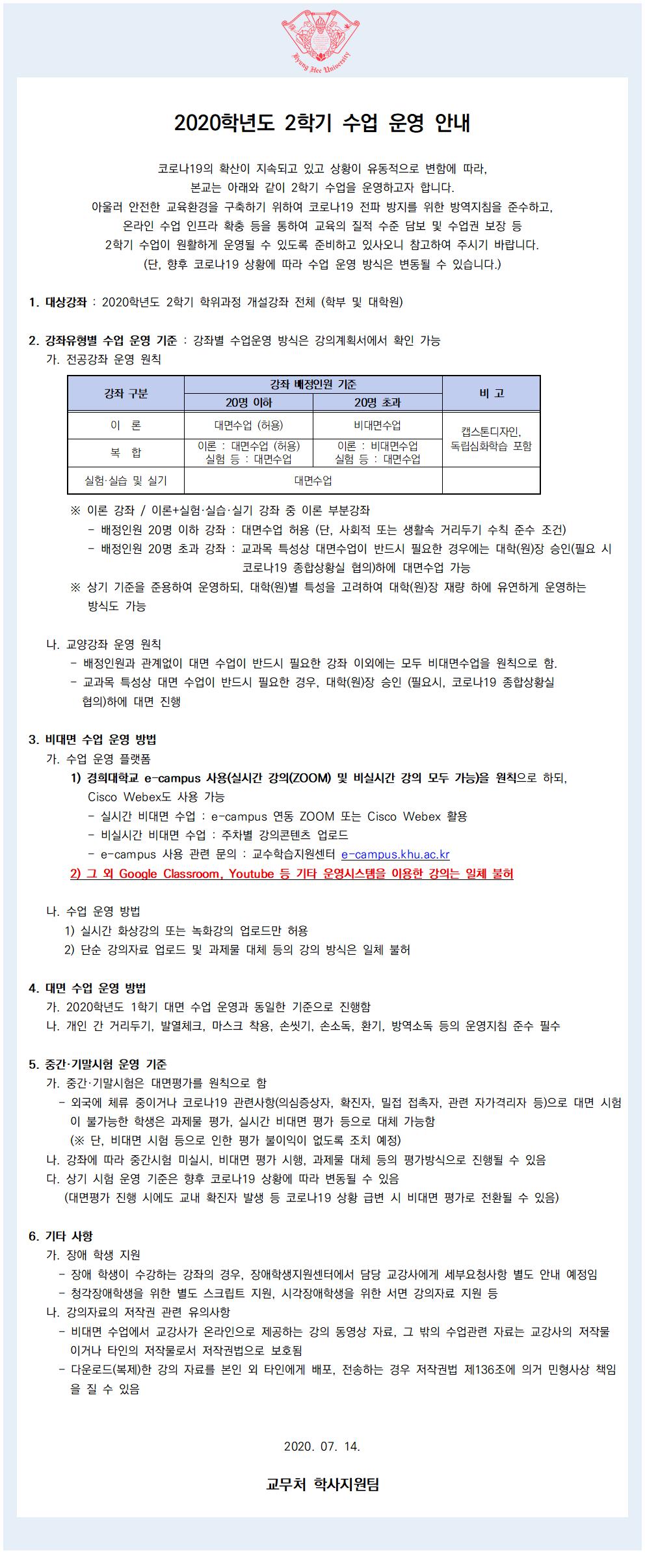 본교는 코로나19를 예방하고 안전한 교육환경을 구축하기 위해 다음과 같이 2020-2학기 수업을 운영하고자 합니다.