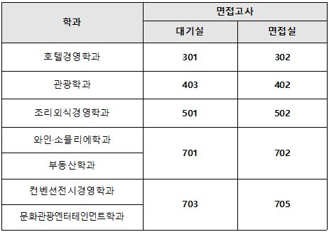 - 캠퍼스약도 : 정문 진입 후 교시탑에서 좌회전한 후, 첫 번째 보이는 건물(호텔관광대학)