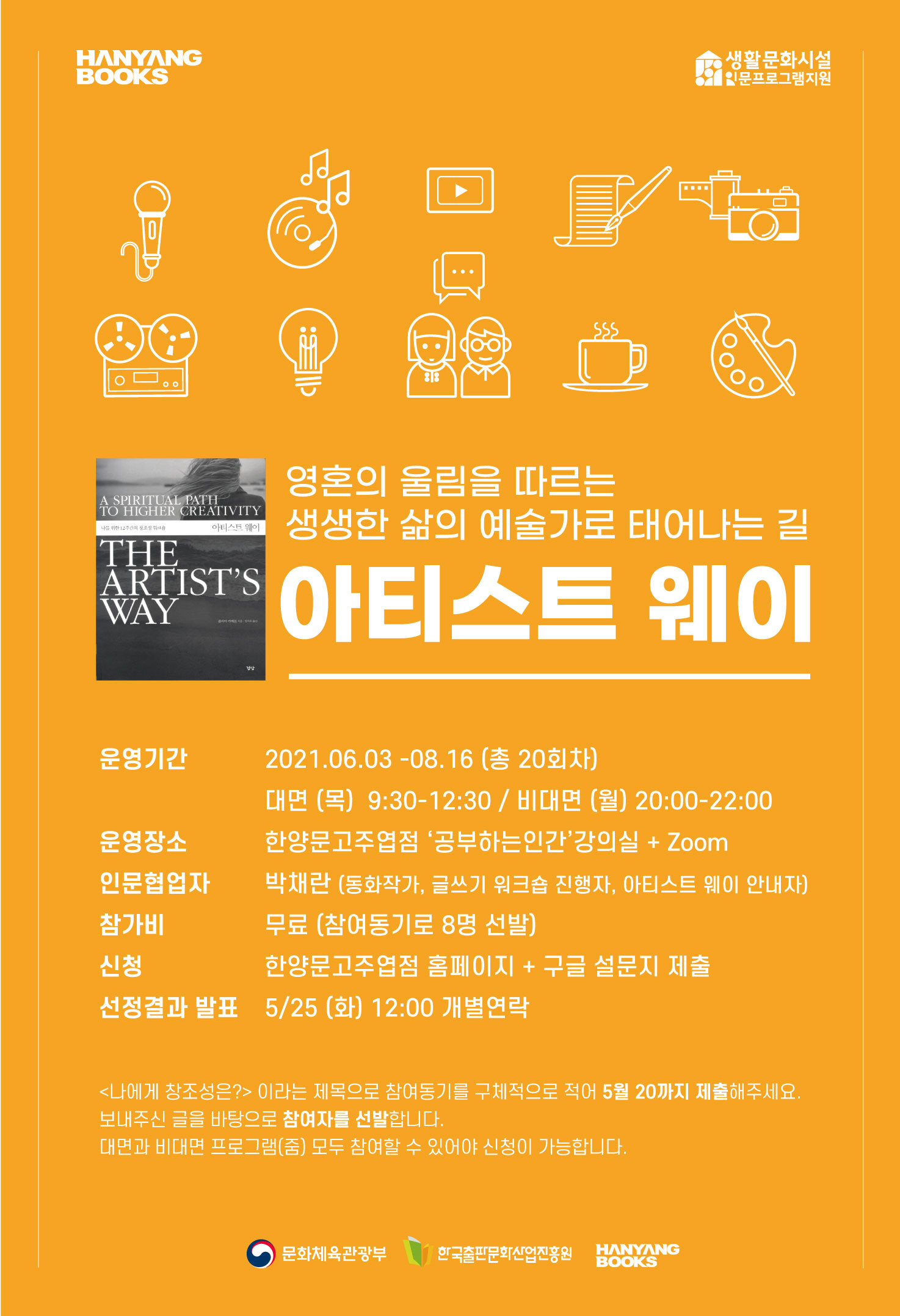 줄리아 카메론의 책 <아티스트 웨이>를 바탕으로 참여자들의 내면에 숨어 있는 창조성을 일깨우고, 이를 바탕으로 자기만의 예술활동을 발견하고 이를 지속할 수 있도롣 돕는 프로그램입니다.
