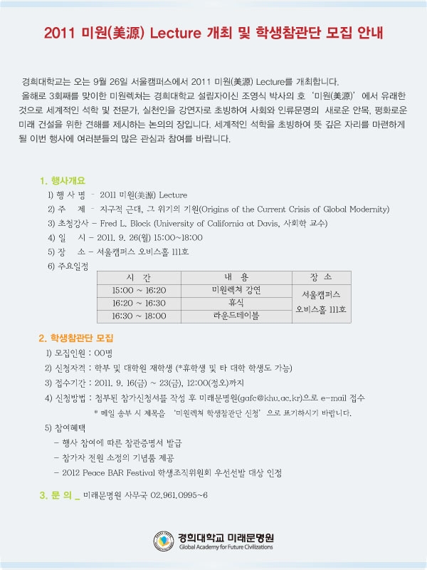 논의의 장인 미원렉쳐가 9월 26일(월)에 서울캠퍼스 오비스홀 111호에서 개최될 예정입니다.