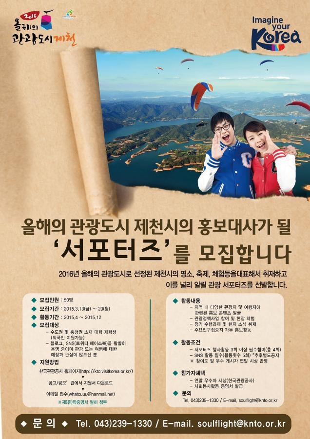 2016년 올해의 관광도시로 선정된 제천시의 명소, 축제, 체험 등을 대표해서 취재하고 이를 널리 알릴 관광 서포터즈를 선발합니다.